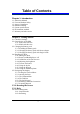 Table of Contents Chapter 1. Introduction 1.1: About this Manual 1.2: User and Product Safety 1.3: Agency Compliance 1.4: Product Labeling 1.5: System specifications 1.6: Environment standard 1.7: Warranty and after service Chapter 2. Getting Started 2.1: Check the Package 2.2: General view of the PDA 2.2.1: PDA front side view 2.2.2: PDA back side view 2.3: Charging the Battery pack 2.3.1: Installing the Battery pack 2.3.2: Charging the battery pack with Power adapter 2.3.