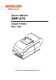 SRP-270 ■ About About this Manual This Service Manual describes how to perform hardware service maintenance for the BIXOLON SRP-270 Receipt Printer. Notes Notes may appear anywhere in the manual. They draw your attention to additional information about the item. Precaution symbols Indicates a Safety Precaution that applies to this part component. Indicates the part or component is an electro-statically sensitive device. Use caution when handling these parts. Copyright ⓒ 2008 by BIXOLON Co., Ltd.