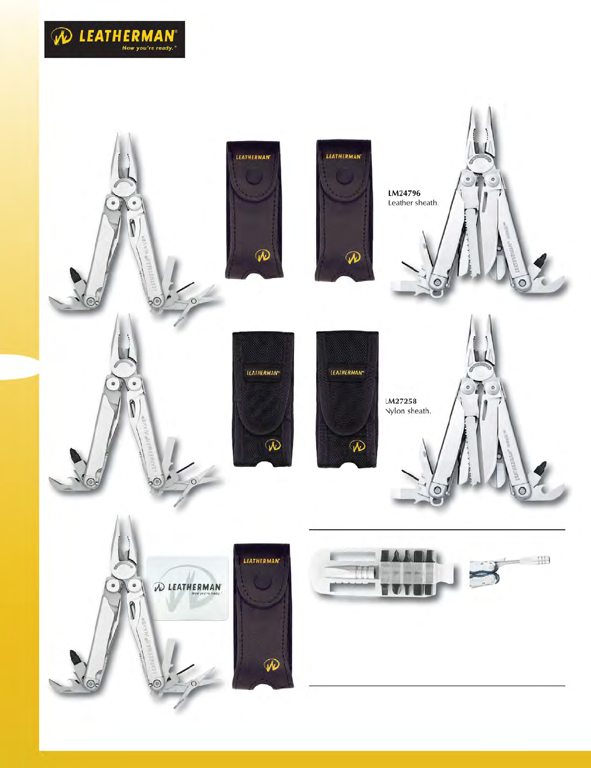 Wave®. 4 " closed. Stainless construction. All blades lock. Features: needlenose pliers, wire cutters, hard wire cutters, clip point blade, serrated sheepsfoot blade, saw, scissors, wood/metal file, diamond-coated file, large bit driver, large screwdriver, small bit driver, 2 double-end S2 tool steel bits, ruler (8 inch/19 cm), bottle/can opener, wire stripper, lanyard attachment. Surge™. 4 1/2" closed. Stainless construction. All blades lock.