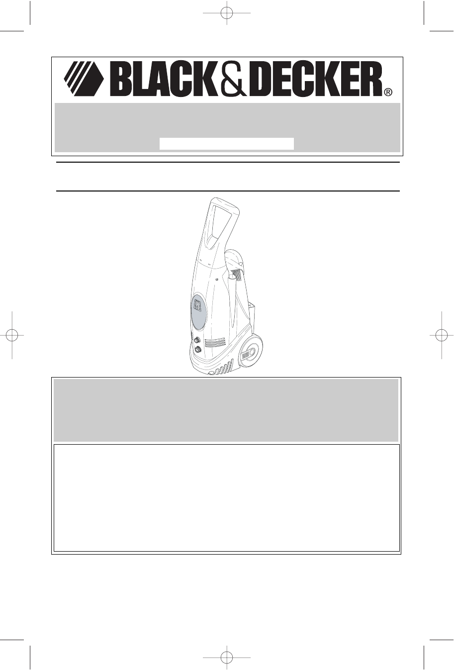 598121-00 Pressure Wash Revised 11/24/03 2:00 PM Page 1 1 3 A m p E l e c t r i c P o w e r Wa s h e r Catalog Number PW1500 INSTRUCTION MANUAL BEFORE RETURNING THIS PRODUCT FOR ANY REASON PLEASE CALL 1-800-544-6986 IF YOU SHOULD EXPERIENCE A PROBLEM WITH YOUR BLACK & DECKER PRODUCT, CALL 1-800-544-6986 IN MOSTCASES,ABLACK & DECKER REPRESENTATIVE CAN RESOLVE YOUR PROBLEM OVER THE PHONE. IF YOU HAVEASUGGESTION OR COMMENT, GIVE USACALL. YOUR FEEDBACK IS VITALTO BLACK & DECKER.