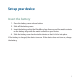 Set up your device Insert the battery 1. Press the battery cover release button. 2. Slide off the battery cover. 3. Insert the battery so that the BlackBerry logo faces up and the metal contacts on the battery align with the metal contacts on your device. 4. Slide the battery cover back onto the device so that it clicks into place. If the battery is charged, the device turns on. If the device does not turn on, charge the battery.