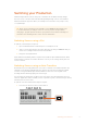 Now when you do quick export, you will be exporting an Ultra HD master, all from an HD switcher! Capture Video When using Blackmagic Desktop Video products, you can record your program output from your ATEM SDI using capture video. Connect your SDI output on the switcher to the input on your desktop video device, for example UltraStudio 4K Mini. To capture: 1 Press the capture settings tab. 2 Select the desktop video device, the capture format and save location from the options. Press Select.