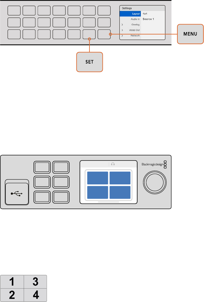 The default view on your Blackmagic Multiview 4 is the 2x2 layout. To change the layout on