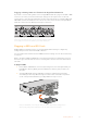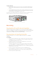 216 2160p30 01:23 Card 2 01:23:47:08 The indicator above the SD card slot illuminates red when recording video Recording Video with HyperDeck Studio SSD Models 1 Insert your formatted SSD into either SSD slot. The LED strip surrounding the drive will illuminate green as HyperDeck reads the disk. When the slot light turns off, your HyperDeck is ready to record. 2 Press the input button on the control panel to cycle through your HyperDeck’s inputs.