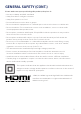 GENERAL SAFETY (CONT.) Please make sure upon positioning this product, the place is: • Not wet or damp and Well ventilated • Away from direct sunlight or heaters. • Away from splashes or food. • Protected from excessive dust or grease. • Do not install this equipment in a confined space such as a bookcase or similar unit. • Do not install the TV set near heat sources such as radiators, stoves or other audio visual equipment that produce heat.