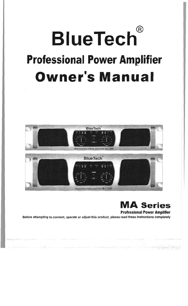 BlueTech Professional Power Amplifier Owner's Manual MA Series Professional Power Amplifier Before attempting to connect, operate or adjust this product, please read these instructions completely