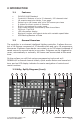 2. INTRODUCTION 2.1 Features • • • • • • • • • • • DMX512/1990 Standard Controls 16 fixtures of up to 12 channels, 192 channels total 18 preset scene/color banks, 9 per page Record up to 18 chases with up to 200 scenes per chase 6 sliders for direct control of channels Built-in microphone for music mode Auto mode program controlled by fade time sliders DMX out: 3-pin XLR LED information display Blackout function and instant strobe with variable speed fader USB Backup/Restore of Data 2.