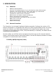 2. INTRODUCTION 2.1 Features • • • • • • • • • • • DMX512/1990 Standard Controls 24 intelligent lights of up to 16 channels, totally 384 channels 30 banks, each with 8 scenes; 6 chase, each with up to 240 scenes Record up to 6 chases with fade time and speeds 16 sliders for direct control of channels MIDI control over banks, chases and blackout Built-in microphone for music mode Auto mode program controlled by fade time sliders DMX in/out: 3 pin XLR LED gooseneck lamp Plastic end housing 2.