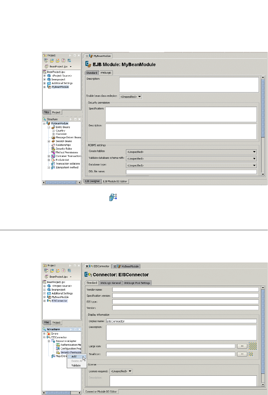your selected server. Here you can see a WebLogic-specific page selected for an EJB