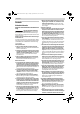 OBJ_DOKU-28019-001.fm Page 72 Friday, September 23, 2011 8:28 AM 72 | Svenska f Använd ett felströmsskydd om det inte är möjligt att undvika elverktygets användning i fuktig miljö. Felströmsskyddet minskar risken för elstöt. Personsäkerhet f Var uppmärksam, kontrollera vad du gör och använd elverktyget med förnuft. Använd inte elverktyg när du är trött eller om du är påverkad av droger, alkohol eller mediciner. Under användning av elverktyg kan även en kort ouppmärksamhet leda till allvarliga kroppsskador.