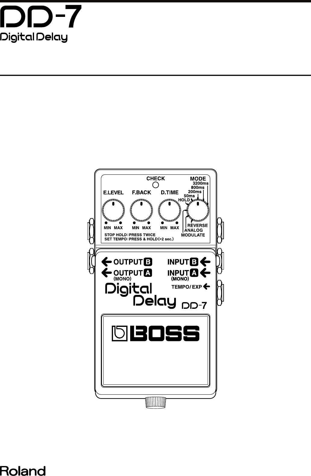 May. 2008 6. Adjust the MODE control to the 200 ms position. Verify that waveform output stops. The CHECK LED goes dark. fig.DD-7-wave-2.eps_75 DD-7 5. DA Check (EXP [Expression Pedal] Check) Make the connections shown below to the INPUT and OUTPUT jacks on the DD-7, using the settings indicated. INPUT A: Input a rectangular wave at 400 Hz, 800 mVp-p. INPUT B: Input a rectangular wave at 400 Hz, 800 mVp-p. OUTPUT A: Connect the oscilloscope. OUTPUT B: Connect the oscilloscope.