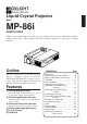 Liquid Crystal Projector Model MP-86i USER’S GUIDE Thank you for purchasing this L.C.D. projector. Please read the user’s manual thoroughly to ensure correct usage. After reading, store this instruction manual in a safe place for future reference. Outline This L.C.D. projector is used to project various computer signals as well as NTSC/PAL/SECAM video signals onto a screen. Little space is required for installation and large images can easily be projected.