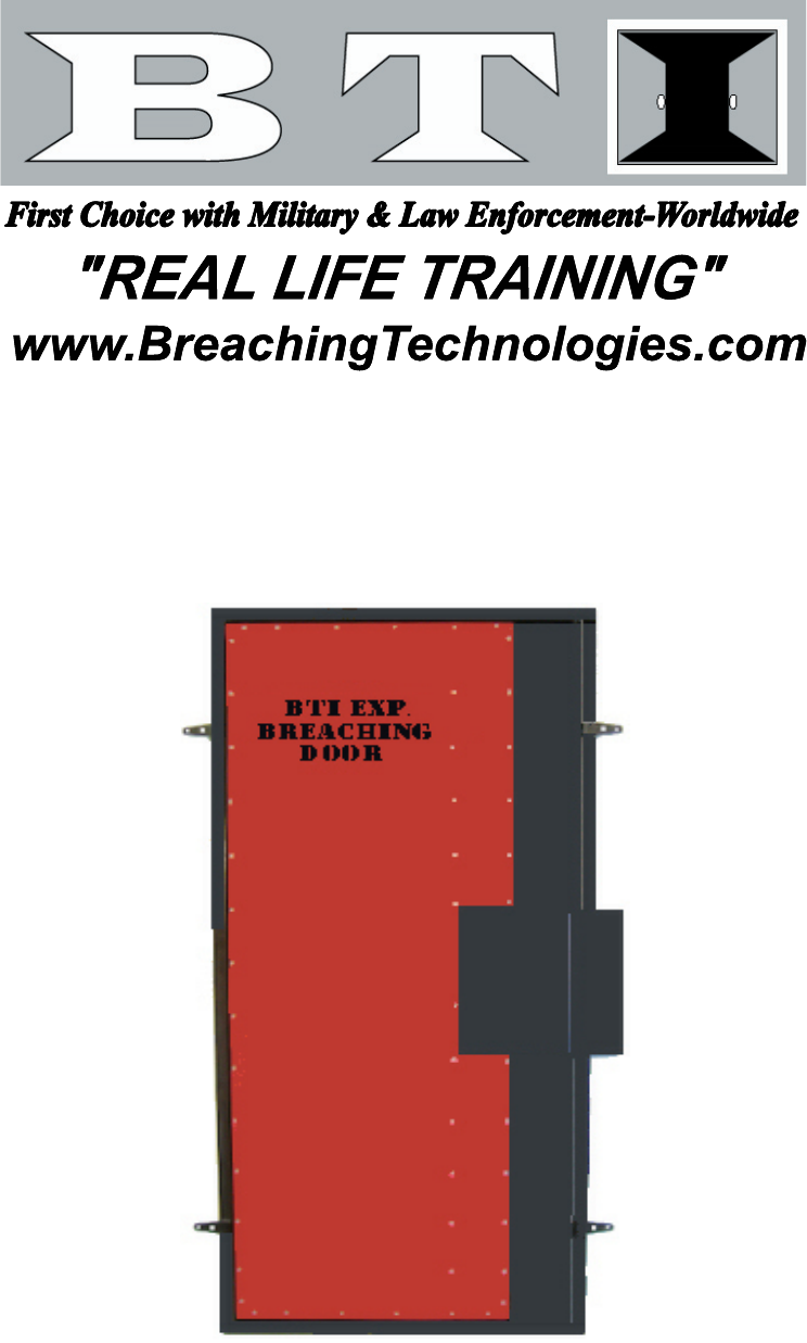 Thank you for your purchase and use of the BTI Breaching Door system. This innovative and patented training device provides realistic training scenarios that are discussed on the following pages. The BTI Strip/Lock Explosive Breaching Door is designed to promote realism in training. The door is not designed or intended to train explosive personnel on the sizing or design of breaching charges.
