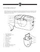 YOUR BREADMAN® The illustrations in this Instruction Manual are for informational purposes only. You may find your Bread Baker and parts look different, however, the steps for operation are the same. 1 2 8 3 4 9 5 6 7 1. 2. 3. 4. 5. 6. 7. 8. 9. 10. 11. 12. 13. Viewing Window Lid(s) (P/N’s Left 21707, Right 21708) Lid Handle Baking Chamber Motor Housing Power Cord Power Plug Control Panel Air Vents Pan Handle Kneading Blade (P/N 21704) Bread Pan (P/N 21703) Drive Shaft 10 11 12 13 5.