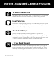 Optics Lens 28 mm (35mm equivalent) 60 cm (Minimum) Recording Video Fast Playback Time Lapse Video Format AVI 720P(1280x720) Memory Storage SD Card ( Supported up to 32GB) Power Power source 2 x D cell Batteries Battery Life 14 months* External Power DC IN: 5V Dimension Size(DxWxH) 106x110x78 mm (4.13”x4.29”x3.04”) Weight 250g (without batteries) Color Black Operation Temperature - 20°C ~ 50°C - 4°F ~ 122°F Focal Length Focus Distance 1. Batteries last 14 months usage under time lapse mode.