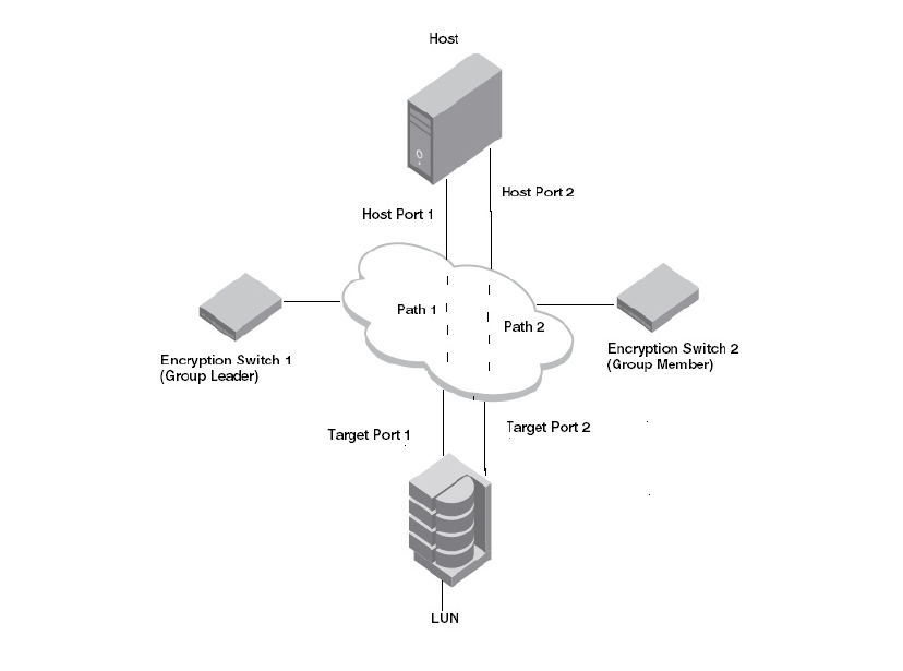 a dual-port host. The two encryption switches form an encryption group and an HA cluster. The