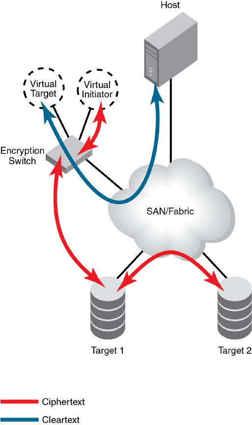 and LUN provided by the encryption switch is mapped to target1 and LUN1. Data is encrypted and