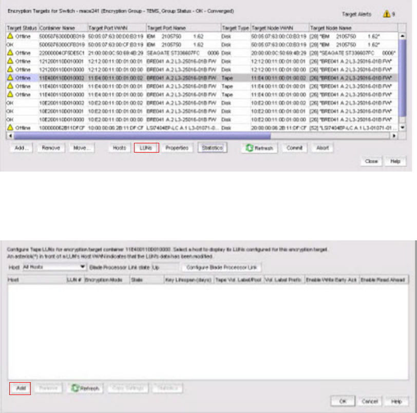 The Encryption Target Tape LUNs dialog box displays. (Refer to Figure 56.)