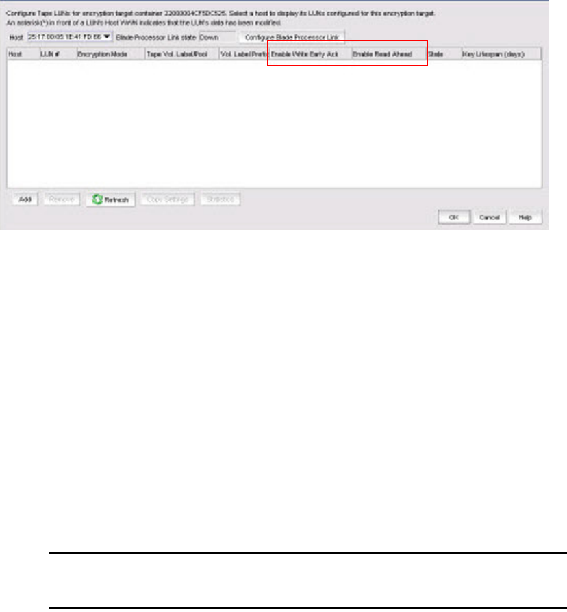FIGURE 59 Encryption Target Tape LUNs dialog box - Setting tape LUN read ahead and write early