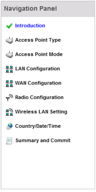 The first page of the Initial AP Setup Wizard displays the Navigation Panel and
