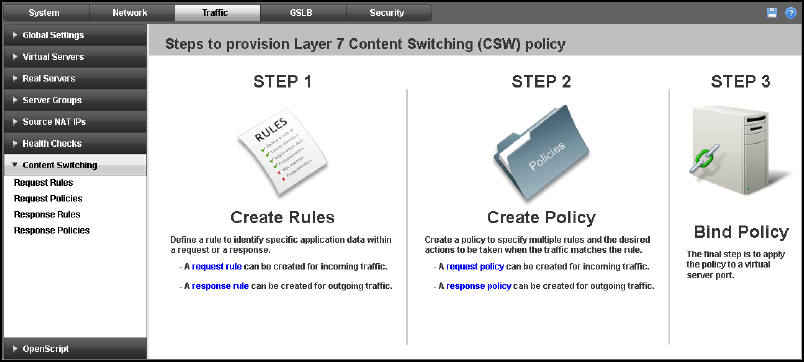 The steps to provision the Layer 7 Content Switching (CSW) policy page are displayed, as