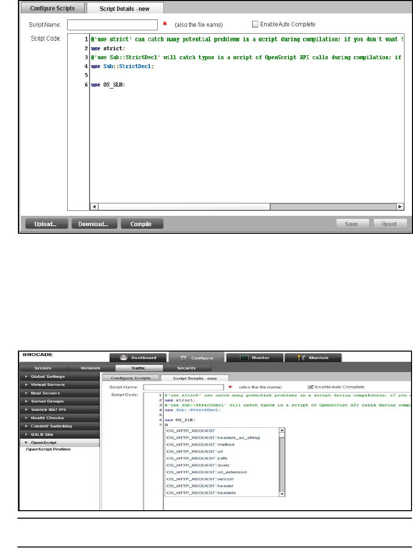 • Script code: Enter the executable code of the script. Select Enable Auto Complete for a