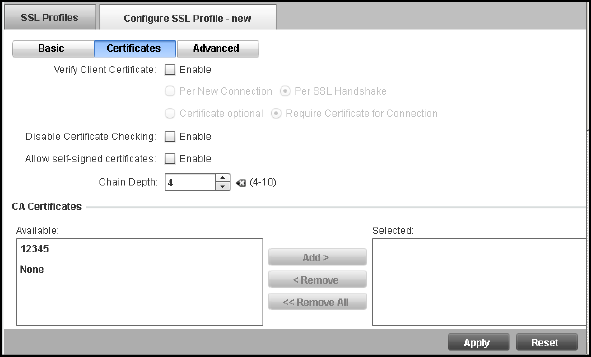5. Click Certificates tab to specify additional options under the SSL profile.