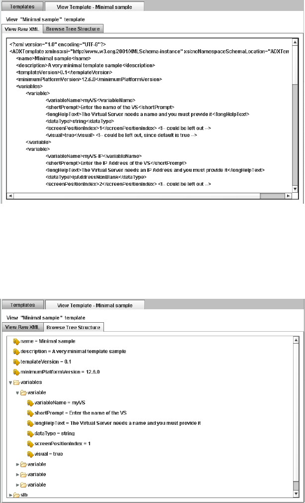 • The View Raw XML tab contains the XML for the template. Within the text area, you can