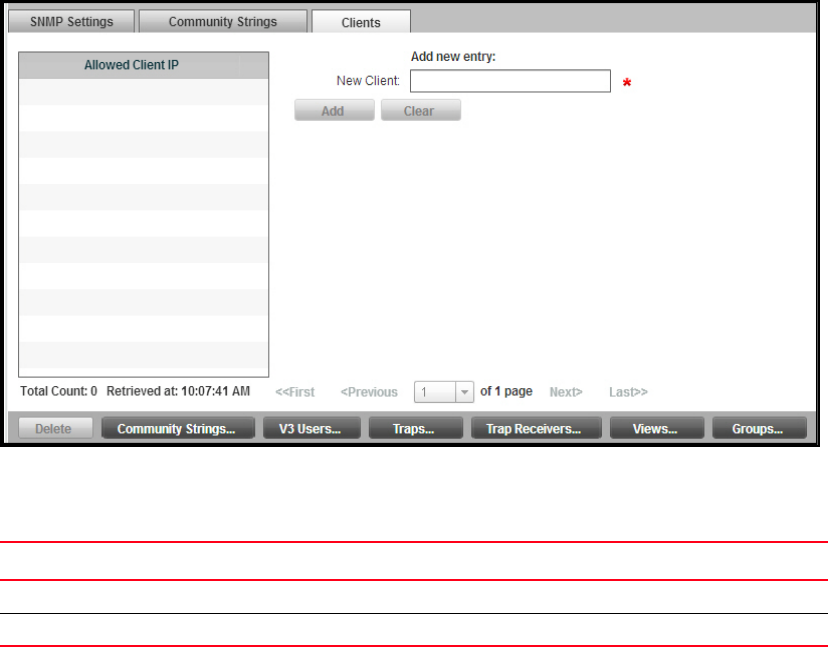 • Select one or more rows to enable the Delete button to delete Clients from the table.