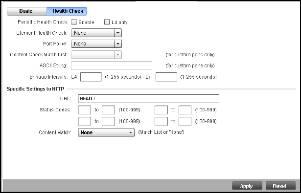 • Bringup Intervals: Enter the Layer 4 and Layer 7 bringup intervals to enable the health