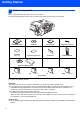 Getting Started 1 Carton components Carton components may vary from one country to another. Save all packing materials and the carton in case for any reason you must ship your machine. Quick Setup Guide CD-ROM User’s Guide Telephone Line Cord Test Sheet (USA only) Accessory Order Form Side Cover Cordless Handset Cyan (LC51C) Magenta (LC51M) Battery and Battery Cover Black (LC51BK) Yellow (LC51Y) Ink Cartridges An interface cable is not a standard accessory.