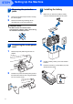STEP1 6 Setting Up the Machine Install each ink cartridge in the direction of the arrow on the label. Take care to match the color of the lock release lever (1) with the cartridge color (2), as shown in the diagram below. Cleaning i i i i i Preparing System Approx 4 Minutes 2 1 M 7 brother XXXX Lift each lock release lever and gently push it until it clicks, and then close the ink cartridge cover.