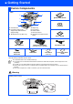 ■ Getting Started Carton Components 8 MFC 1 7 Quick Setup Guide 2 3 6 5 4 1. Control Panel 2. Face-down Output Tray Support Flap with Extension (Support Flap) 3. Multi-purpose Tray (MP Tray) CD-ROM 4. Paper Tray 5. Front Cover 6. Power Switch 7. Document Cover 8.