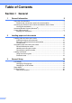 Table of Contents Section I 1 General General Information 2 Using the documentation .......................................................................................2 Symbols and conventions used in the documentation ....................................2 Accessing the Software User’s Guide and Network User’s Guide ........................3 Viewing Documentation...................................................................................3 Accessing Brother Support (Windows®) .................