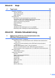 Indholdsfortegnelse Afsnit I 1 Generelt Generel information 2 Brug af dokumentationen.......................................................................................2 Symboler og regler, der bruges i dokumentationen.........................................2 Adgang til softwarebrugsanvisningen og netværksbrugsanvisningen ...................2 Sådan får du vist dokumentation .....................................................................2 Adgang til Brother Support (Til Windows®) .............