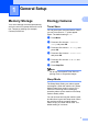 1 General Setup Memory Storage Your menu settings are stored permanently, and in the event of a power failure will not be lost. Temporary settings (for example, Contrast) will be lost. 1 1 1 Ecology features 1 Toner Save 1 You can save toner using this feature. When you set Toner Save to On, prints appear lighter. The default setting is Off. a b Press Menu. Press a or b to choose 1.General Setup and press OK. c Press a or b to choose 2.Ecology and press OK. d Press a or b to choose 1.