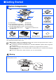 ■ Getting Started Carton Components 8 DCP 1 7 Quick Setup Guide 2 3 6 5 4 4. Paper Tray 5. Front Cover Flap with Extension (Support Flap) 6. Power Switch 3. (For DCP-8040) Manual Feed Tray 7. Document Cover (For DCP-8045D) Multi-purpose 8. Automatic Document Feeder 1. Control Panel 2.