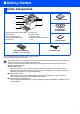 ■ Getting Started Carton Components 1 2 8 7 3 4 6 5 1. Automatic Document Feeder (ADF) 2. Control Panel 3. Face-down Output Tray Support Flap (Support Flap) Quick Setup Guide CD-ROMs For Windows® For Macintosh® 5. Paper Tray 6. Power Switch 7. Document Cover 8. ADF Document Output Support 4. Front Cover Flap Drum Unit Assembly (including Toner Cartridge) User’s Guide AC Power Cord Carton components may differ from one country to another. Save all packing materials and the carton.