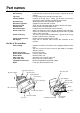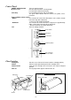 Part names Outside of the machine DC connector Top cover Viewing window Document tray Document supporter Document guide Control panel Document output Corner cutter slot Corner cutter tray Corner cutter dust box AC adapter Located on the left, backside of the machine. Aperture for the AC adapter. For replacing the film cartridge and cutter units. Located on the top cover. Allows you to make sure that the correct type of film cartridge is loaded into the machine. Where documents to be laminated are placed.