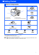 ■ Getting Started Carton Components MFC Quick Setup Guide 4 1 3 CD-ROM 2 1. Control Panel 2. Scanner Cover 3. Document Cover 4. Automatic Document Feeder (ADF) User’s Guide Output Paper Support Paper Tray Telephone Line Cord Power Cord Black Magenta Yellow Cyan (LC800BK) (LC800M) (LC800Y) (LC800C) Ink Cartridges Carton components may differ from one country to another. Save all packing materials and the carton. ■ You must use the appropriate USB cable.
