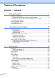 Table of Contents Section I 1 General General Information 2 Using the documentation .......................................................................................2 Symbols and conventions used in the documentation ....................................2 Accessing the Software User’s Guide and Network User’s Guide ........................2 Viewing Documentation ...................................................................................3 Accessing Brother Support (For Windows®) ............