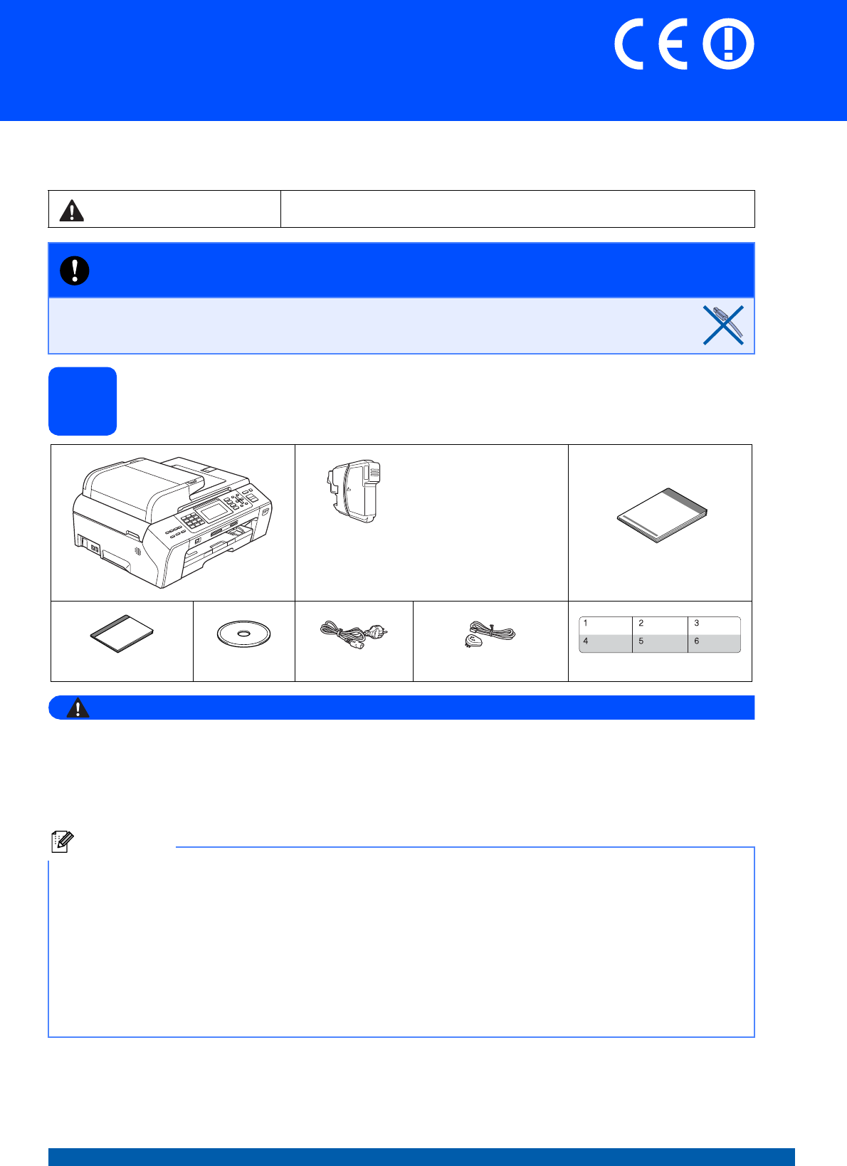 Installatiehandleiding Hier beginnen MFC-5895CW Volg de installatie- en configuratie-instructies in deze installatiehandleiding voordat u de machine in gebruik neemt. WAARSCHUWING Waarschuwingen informeren u over de maatregelen die u moet treffen om persoonlijk letsel te voorkomen. BELANGRIJK Sluit de USB-kabel nu nog NIET aan (als u een USB-kabel gebruikt).