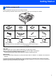 Getting Started 1 1 Carton components Carton components may vary from one country to another. Save all packing materials and the carton in case for any reason you must ship your machine. Quick Setup Guide CD-ROM User’s Guide Telephone Line Cord Power Cord USB Interface Cable Telephone Handset Side Cover Black (LC960BK) Yellow (LC960Y) Cyan (LC960C) Magenta (LC960M) The ink cartridges are on top of the paper tray. See Removing the protective parts on page 5.