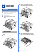 2 Odstraňte obalový materiál ze zařízení e Zatáhněte za proužek papíru pro vyjmutí ochranného materiálu, jak je to ukázáno na obrázku. DŮLEŽITÉ Zatím NEPŘIPOJUJTE zástrčku kabelu střídavého napájení. a b c Odstraňte obalovou lepící pásku na vnějšku zařízení a fólii na skle skeneru. Otevřete přední kryt. Vyjměte balíček se silikagelem z vnitřku zařízení. f Vytáhněte sestavu fotoválce a tonerové kazety. CAUTION UPOZORNĚNÍ Silikagel NEJEZTE. Prosím zlikvidujte jej.
