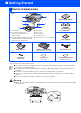 ■ Getting Started Carton Components 8 M FC 1 7 Quic k Se tup G uide 2 3 6 5 4 1. Control Panel 2. Fac e-down Output T ray Support Flap with Ex tens ion (Support Flap) 3. (For MF C-8420) Manual Feed Tray (Fo r M FC -8 82 0 D a nd M FC -88 2 0D N ) M u lti-pu rpo se T ra y (M P Tra y) ADF Support 4. 5. 6. 7. 8.