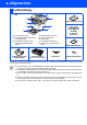 ■ Allgemeines Lieferumfang 8 MFC 1 7 Installationsanleitung 2 3 6 5 4 CD-ROMs 1. Funktionstastenfeld 2. Papierablage (Druckseite unten) mit Verlängerung 3. MFC-8440: Manuelle Zufuhr MFC-8840D: Multifunktionszufuhr Vorlagenstütze mit Verlängerung 4. Papierkassette (Zufuhr 1) 5. Vordere Abdeckung 6. Netzschalter 7. Vorlagenglas-Abdeckung 8.