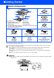 ■ Getting Started Carton Components 8 MFC 1 7 Quick Setup Guide 2 3 6 5 4 4. Paper Tray 5. Front Cover Support Flap with Extension 6. Power Switch 7. Document Cover (Support Flap) 3. (For MFC-8440) Manual Feed Tray 8. Automatic Document Feeder (ADF) 1. Control Panel 2.