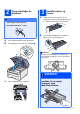 2 Fjern emballagen fra maskinen a VIGTIGT! • Gem emballagen og kassen, hvis det bliver nødvendigt at sende maskinen. 3 Installer tromler og tonere Udpak de fire tromler og tonere, og ryst forsigtigt hver af dem fra side til side flere gange for at fordele toneren lige inden i enheden. • Sæt IKKE netledningen i endnu. b a b Fjern beskyttelsesdækslet ved at trække i tappen, som vist på illustrationen. Fjern emballeringstapen uden på maskinen. Åbn topdækslet ved at løfte op i håndtaget a.