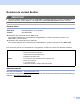 Annexe B Menu principal Sous-menu Sélections de menu 7.Réseau 1.LAN filaire 1.TCP/IP (suite) (suite) Options B 8.Serveur DNS (suite) (Primaire) [000-255].[000-255]. [000-255].[000-255] [000].[000].[000].[000]* (Secondaire) [000-255].[000-255]. [000-255].[000-255] [000].[000].[000].[000]* 9.APIPA Activé* Désactivé 0.IPv6 Marche Arrêt* 2.Ethernet — Auto* 100B-FD 100B-HD 10B-FD 10B-HD 3.Sél par défaut 4.Câblé 1.Init. — 2.Quitt — — Marche* Arrêt 2.RL sans fil 1.TCP/IP 1.