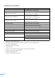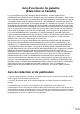 Spécifications Modèle Niveau de bruit MFC-9130CW Pression sonore Puissance sonore Impression LPAm = 53,0 dB (A) Prêt LPAm = 33 dB (A) Impression LWAd = 6,42 B (A) LWAd = 6,39 B (A) LWAd = 6,41 B (A) LWAd = 6,42 B (A) Prêt LWAd = 4,38 B (A) LWAd = 4,44 B (A) Fonctionnement 50 à 90,5°F (10 à 32,5 °C) Entreposage 32 à 104 °F (0 à 40 °C) Fonctionnement 20 % à 80 % (sans condensation) Entreposage 10 % à 90 % (sans condensation) (Couleur) Impression (Noir et blanc) Température Humidité MF